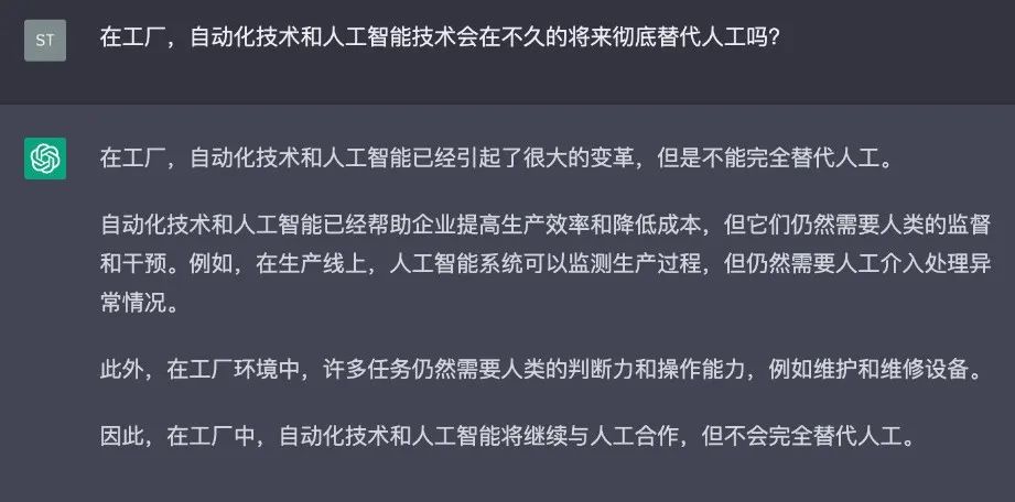此外,针对最近大家热议的ChatGPT是否会抢了某些行业打人工的饭碗,对于这一问题,也有网友询问了ChatGPT,未来自动化技术和人工智能技术会彻底替代人工吗?ChatGPT也给出答案:不会。