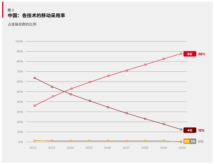 GSMA预计,5G将于2024年超过4G成为中国最主流的移动技术。该行业组织同时指出,4G和5G在中国成为主流意味着传统网络(2G和3G)目前正在被逐步淘汰。虽然大部分用户已经迁移至4G和5G,但传统网络仍在继续支持各种物联网业务。然而据估计,到2025年,中国的传统网络可能几乎彻底关停。